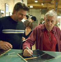 On Thursday, opening night, there was quite a large crowd in attendance. The gallery was pretty filled, and from what I understand, this was a larger room than the one from the London exhibit. Storm was seated at a table, talking to people, signing books and such, being his entertaining and charming self. I introduced my wife, Marcia, who jokingly commented that there was a striking resemblance between us, after seeing the picture that was taken outside the hotel a few days earlier, and wanted to know his whereabouts in February of 1959. Storm got a good chuckle out of this, and so did his son Bill who was standing just a few feet away. I asked Storm if he would sign my first edition of “Mind Over Matter” (which I ran out and bought the first day it came out, even though I had the flu), and he did by signing, “To my son (????) Storm Thorgerson, 2005.” We all got a huge laugh from this, and I thanked him once more.