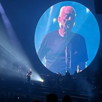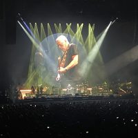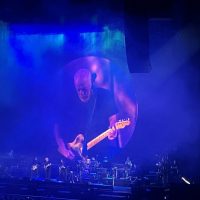 Lights and staging were off the hook, in Floyd tradition. I read recently the lighting designer was Marc Brickman. No wonder. The overhead array in the lighting matrix created raining effects in color and coordinated patterns. The “light box” or “cage” effect created by the lights ringing the perimeter gave “Sorrow” and “Comfortably Numb” moments of sci-fi visuals. Impressive substitutes for Mr. Screen’s lights. Lots of fog. So much so that by intermission and end of show, it was clear the arena was “bombed” – visually (and sonically) by David Gilmour, band and crew.