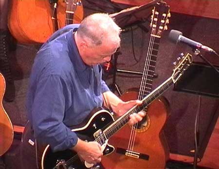 Next, and rather less radically, came Fat Old Sun from the great Atom Heart Mother album (inexplicably ignored on the recent Echoes – the Best of Pink Floyd compilation), on which he was joined by the rest of the band: double bass, drums, acoustic guitar, piano, cello, and a nine-strong vocal ensemble (later, Gilmour also introduced fellow Floydist Rick Wright on keyboards). The song’s aura of dreamy torpor was perfectly suited to the arrangement.