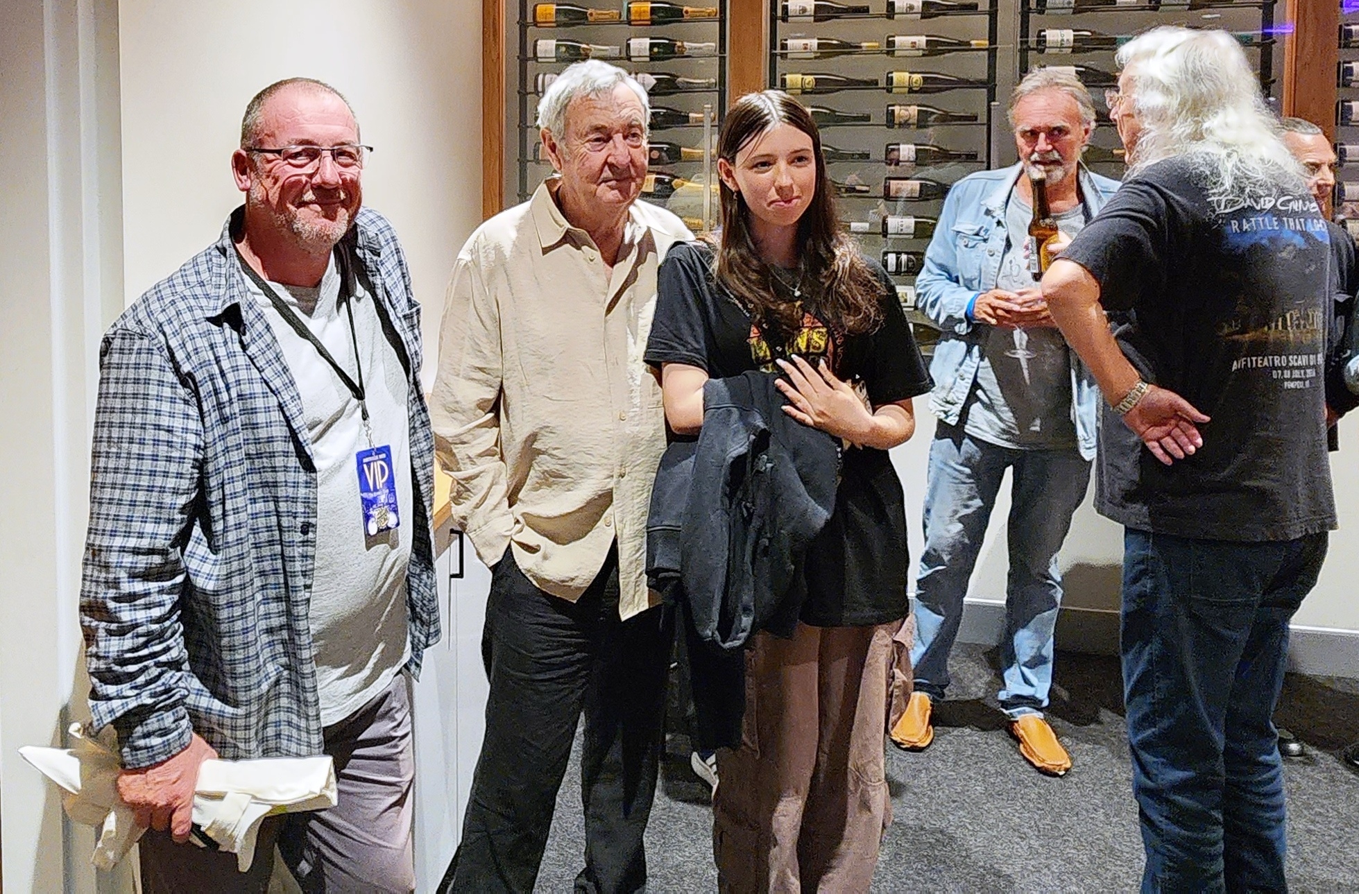 All of a sudden the room felt full, there were about thirty people in there.. I think it was Barry the security guy that DG had with him at the Albert Hall wandering about casually…. A tall bloke in a denim jacket that I didn’t recognise and then Guy appeared.. I’ve met Guy before and I shook hands and said hello… I said…you looked a bit grumpy up there at times mate, “it happens all the time…if they wanna watch it on a screen, go and watch fucking YouTube”… So by this time groups of people were chatting…I’m buzzing…Lee was great…no rush to go anywhere or not chat with me…then all of a sudden… There he was… as Gary said on stage… an original pioneer of rock music… Nick Mason stood a few feet from me…I said to Lee, ‘I’d love to meet him, Lee’… He said sure…and we walked casually over and Lee introduced me to Nick… I said as we shook hands.. “Hi Nick, I’m Lee,the original founder of TAPFS….Please don’t hit me”… There was laughter and a great photo of that moment was taken.. Nick was a delight. Relaxed, not fussed about anything…I was expecting them all to be…right, let’s get this out of the way and off for drinks.. But it wasn’t like that at all.. I got to hang with my hero for at least 20 mins…it may have been more.. It was a living dream… Nick said it was the best Echoes they’ve done yet… I asked why, he said “it was more relaxed, it wasn’t rushed and the audience were really great” That makes a huge difference when there’s a good audience. Some other people came over to meet Nick and at this point I realised I didn’t have anything to get an autograph with…But Col did…ah, good man…can I borrow that sharpie please? As I turned around to go back to Nick, Dom walked in and right up to where I was standing… A glass of white wine in one hand and a bottle in the other…Happy Birthday! I said.. We shook hands and I told him how fantastic it all sounded out the front…the bottom end on his keyboards was massive…