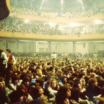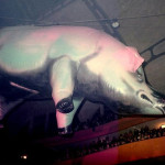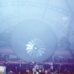 The band’s special effects department still hadn’t got the highpoint of their contribution to the show quite yet. In the middle of the “Pigs” section, which closed the first half, a gigantic inflated porker is meant to fly over the PA, emerging out of a cloud of smoke, clearing the stacks by a few inches, and making a circuit of the hall over the heads of the audience. Well, Mr. Pig made it over the stack all right without toppling the driver horns on the top, but the trouble was the smoke. The first three nights of the tour they couldn’t get enough product out of the rented fog-machine, so they tried a smoke bomb instead. That worked rather too well for comfort, filling the hall with billowing clouds of acrid, throat strangling murk, through which it was barely possible to see that something was happening on stage.