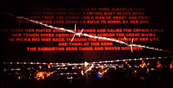 I just got back from the Ice Palace and Rog’s opening night gig. Great show, nothing too unexpected happened. Rog shortened up the first set with the deletion of some Wall material. The major change was the second set which began with Set The Controls. Rog played acoustic guitar and for the first time on the ’99/00 tour was augmented by a saxophonist. Don’t know the guys name, but he played a soprano sax on Set The Controls and later played a tenor on Money. He did not appear in the first set and therefore did not play any of Shine On’s sax parts. The Bravery of Being Out of Range made its debut. Roger played a red Fender Strat on that number. The second set ended with Brain Damage/Eclipse. Comfortably Numb was the first encore, followed by Each Small Candle. Rog gave an abbreviated story behind the song to the audience (who were getting a little impatience at that point I might add). Rog also gave his little speech about how he felt the magic and connection with the audience and thanked everyone who came. He made reference to his “old band” and said how it felt like the old days again.