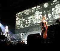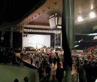 The venue is a hockey arena but from the outside looks dreadfully dilapidated. Inside wasn’t that much better. There were very flimsy plastic seats on the floor area and poor seats around the sides but the rear section of was just concrete steps for standing!!! The stage was not the normal affair – the huge speaker banks weren’t hanging from the ceiling – they were suspended off a temporary frame erected around the stage – very low to the ground. The surround sound speakers were on temporary platforms in the seating areas at the side whilst the projectors were at the rear in the balcony seating area. But this seemed to make for great surround sound and fabulously clear guitar sound. I did notice that the guitars seemed to be coming out the front whilst the keyboards were coming from the sides.