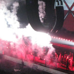 Then the band kicked into “In the Flesh?” with all the pomp and pyrotechnics one would expect. The enormous circular Mr. Screen lit up above with the giant white-and-red crossed hammers. The partially-built wall itself was illuminated with images of graffiti and torn posters, bearing that iconic hammer logo and the legend “TRUST US” — and I was immediately struck by the sheer brilliant clarity of the fifteen gigantic video projectors required to light its staggering entirety. Each individual brick had about the same level of detail and brightness as a high-definition TV, so if you can imagine a whole arena’s width, stacked to the upper bowl with HDTVs, you’ll get some idea of what watching this show is like.