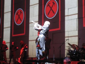 at one point some people thought Mr. Waters was simply in the process of making a grand entrance and was going to come out in full fascist regalia out of some stately limo and banners of the hammers were going to fall down the walls outside of the American Airlines Center and trumpets were going to play and bombs were going to go off and Waters would have a bunch of women and babies to kiss, etc., but no