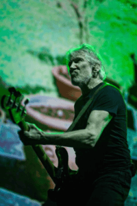 As the fans took their seats, one was reminded of the calm before the storm; a serene image of a woman, her head covered, her back turned to the screen as she sat staring out to sea. But as the sky turns red an ominous feeling creeps in, hinting that all is not well in this world in which we live. The stage laid out with an array of instruments was soon occupied by Waters’ accompanying band who remained note perfect throughout the following [just over] two hour set; the arrival of Waters, dressed simply in a black tshirt and jeans heralded by the crowd as if God himself had walked onto the stage, not that Waters believes in God of course, a fact he reminds us of during the final moments of the show. Happy to slink back and just be part of the band to begin with, Waters quickly proved that he can still play bass with a swagger that belies his humble exterior, leaving many of the Gilmour lead songs to the outstanding Jonathan Wilson, who next to Waters was an absolute stand out with impeccable guitar playing and a voice that quite literally brought a tear to the eye.