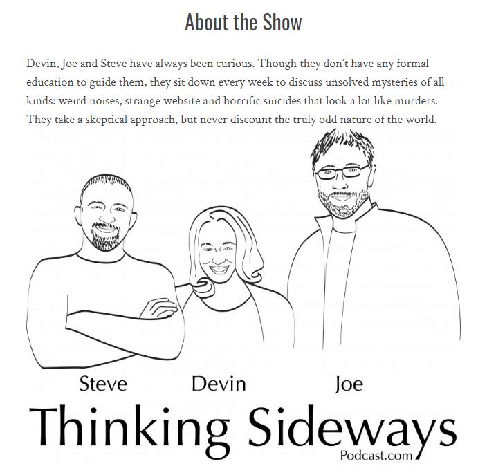 I received an email from Colin Turner, titled “Famous at last!” I opened the email and found a link to an American podcast, Thinking Sideways. This was a weekly podcast in which the three hosts; Devin, Kevin and Nevin – sorry, that’s Devin, Joe and Steve – would discuss unsolved mysteries.