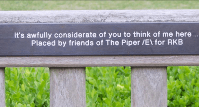 Col sent me a similar picture to this (at left). It is a plaque on a park bench in Cambridge’s Botanical Gardens which is dedicated to “The Piper”, “RKB”, Roger Keith Barrett.