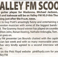 Guy Pratt Live Interview AFG in conjunction with Radio Station Valley FM 95.9 were proud to present a live interview with Guy Pratt on Thursday 23rd July. AFG correspondent Les Bounds chatted to Guy about his current Breakfast Of Idiots standup comedy tour, of his time with Pink Floyd and various other things!