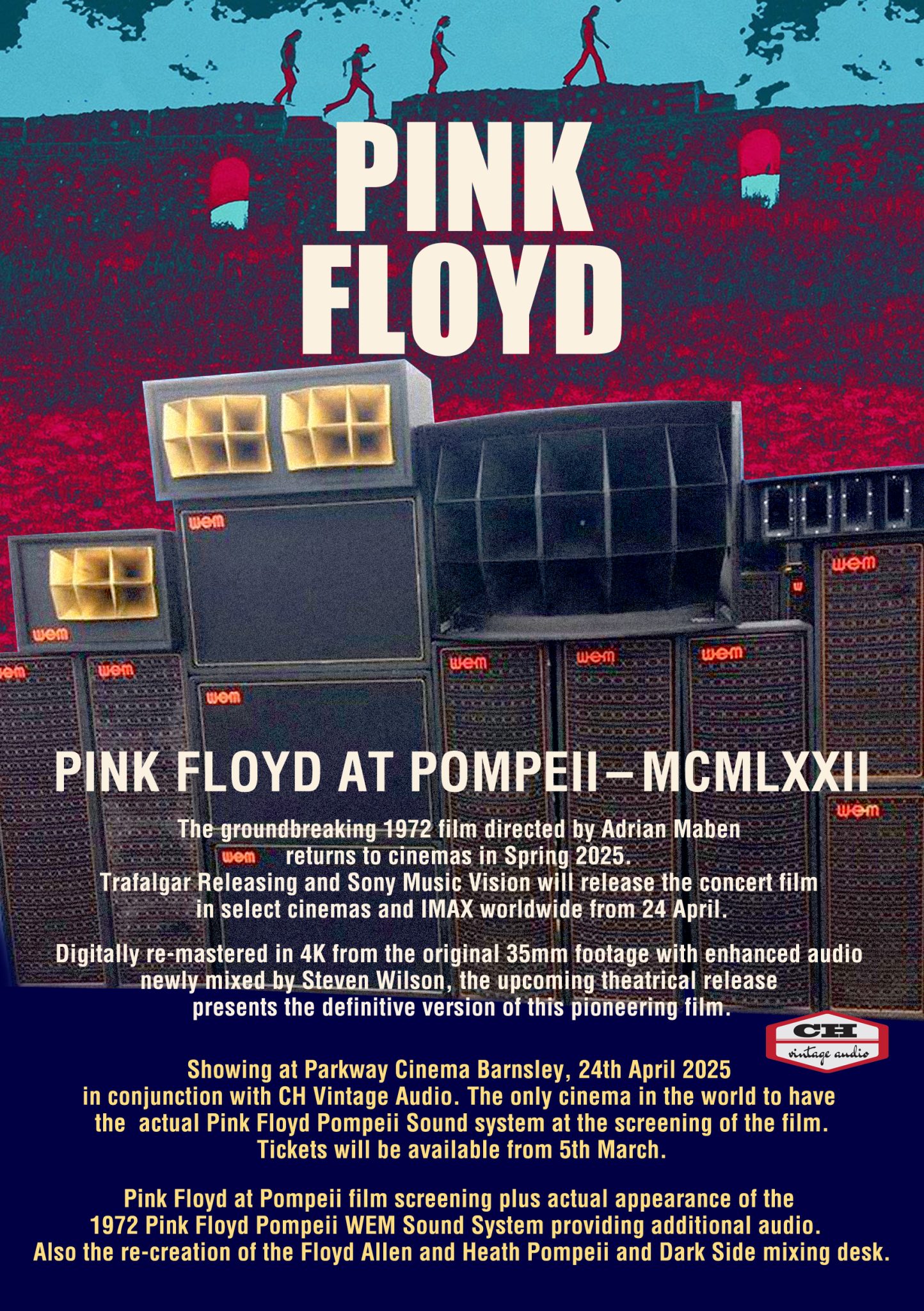 Following last week’s announcement regarding the return of Pink Floyd at Pompeii – MCMLXXII to cinemas and IMAX in April featuring a new 4K transfer and audio remix by Steven Wilson, Parkway Cinema Barnsley will present a special screening on April 24th in conjunction with CH Vintage Audio. This screening will showcase the original Pink Floyd WEM Pompeii sound system during the film, making it the only cinema to do so. Tickets will go on sale starting March 5th. The screening will include the actual 1972 Pink Floyd Pompeii WEM sound system, providing additional audio, alongside a re-creation of the Allen and Heath ‘Pompeii’ & ‘Dark Side’ mixing desk.