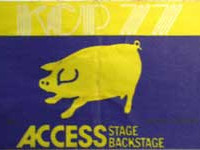 The PA rocked like a house of cards, but stayed together, the crowd went nuts, the colour drained back in to the faces of the band, and my fellow twats and I, got the big ovation from the crowd as we climbed down, shaken and very stirred. We headed straight for the stash and chopped out a big one and washed it down with a scotch. Looking out from the scrim that stretched over a steel frame, and hid the back line, from the audience’s view, we watched as the Pig was slowly turned round, that was the chance for the winch crew to run the motors on the cables and tighten them, Mr Pig was back on his lead.