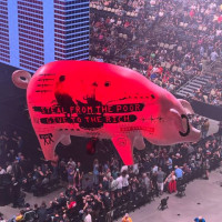 During intermission we were entertained by the flying pig, emblazoned with “[expletive] the Poor” on one side and “Steal from the Poor. Give to the Rich” on the other. It was adorned, as well, with such defense contractor logos as Raytheon and Elbit Systems.